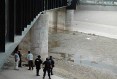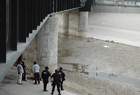 Mexican federal police and forensic experts stand next to the body of 14 year-old Sergio Adrian Hernandez Huereca, under the Paso Del Norte border bridge, as US officials watch from the US side at right, in Ciudad Juarez, northern Mexico, Monday, June 7, 2010. Chihuahua state officials released a statement Tuesday, June 8, demanding a full investigation into the death of the boy who was allegedly shot by a U.S. Border Patrol agent after a confrontation, according to Mexican authorities.(AP Photo) APTOPIX Mexico Border Patrol Shooting